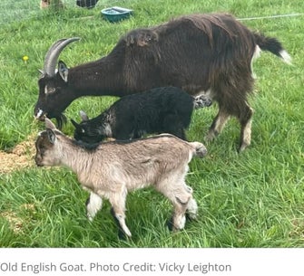 The English Goat is a large, rare breed, with females weighing around 60kg and males around 85kg. They and are short haired, generally of a docile temperament but can be capricious. They’re very hardy and thrive in the British climate. Their horns, when mature, tend to curl outwards and they do not have wattles. Not a fussy eater by any means, will forage anything so great for land clearance so need lots of land to forage as they will not be content in small areas. Due to their strength they make good harness goats.